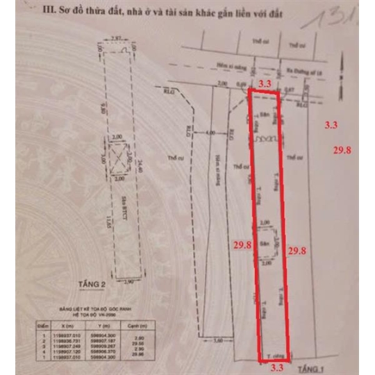 Diện tích: 3.3m x 30m – công nhận 86m² đất ở đô thị